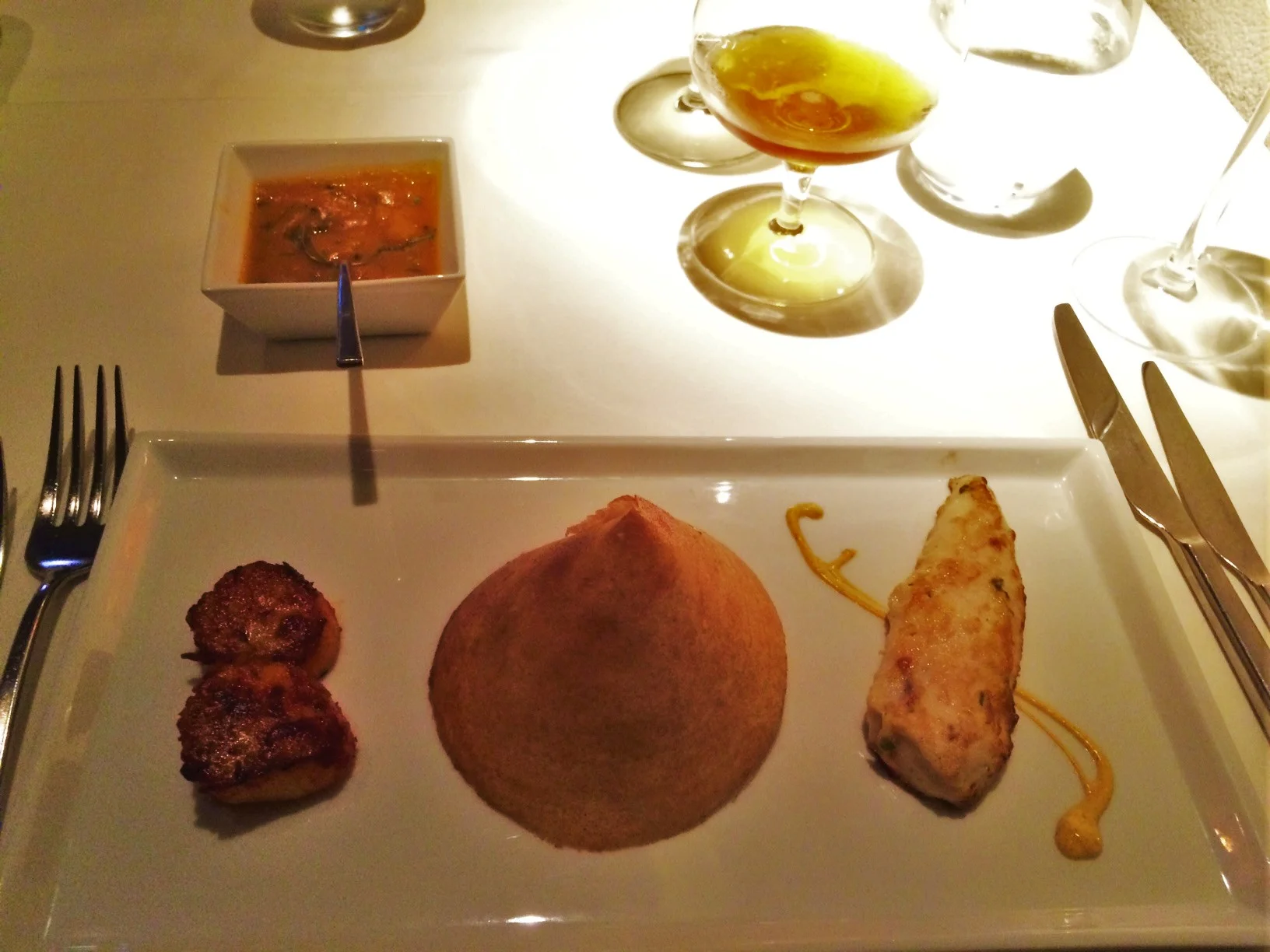 These were followed by a selection of desserts. Pistachio cake, light and warm, served with melted black sesame fondant and pistachio ice cream, a tropical fruit salad unlike any fruit salad you’ve had before, decadent chocolate and hazelnut praline, and a trio of baked yoghurts – confit orange, mango and lychee – which were paradise on a plate with a sweet glass of Sauternes.